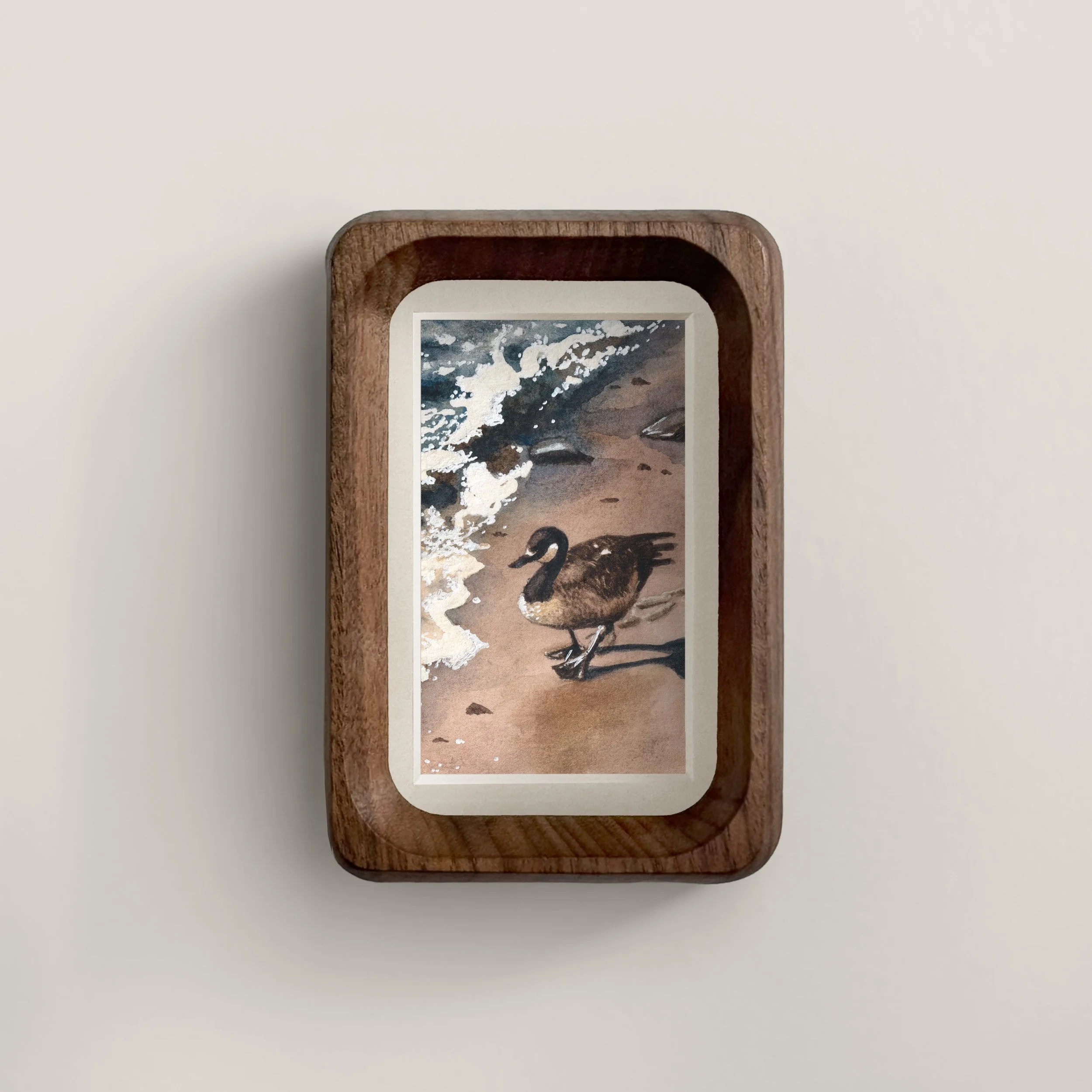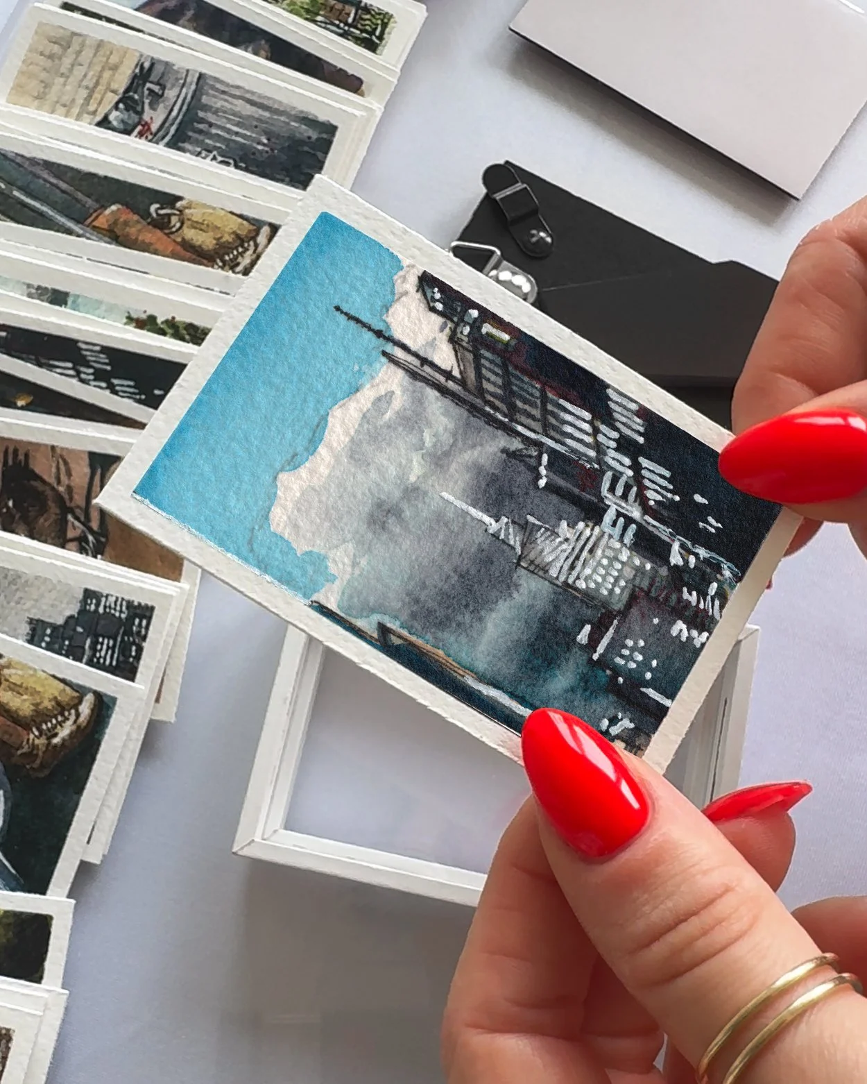 I’m working on a series of pocket-sized watercolors inspired by small, quiet moments I’ve experienced around the city. Some capture scenes that felt very New York (a late-night view of the World Trade Center from a street corner, a brownstone framed by summer foliage); others made the city feel like somewhere else entirely (a sunlit goose on a narrow strip of beach in Williamsburg, a twilight lake view in Prospect Park). My personal favorite in the series, Trash Pigeon, was painted from a day with my mom during her visit to New York. We were walking through Williamsburg when a pigeon landed gracelessly on a nearby trash can with a loud clang, startling us both and making us laugh.